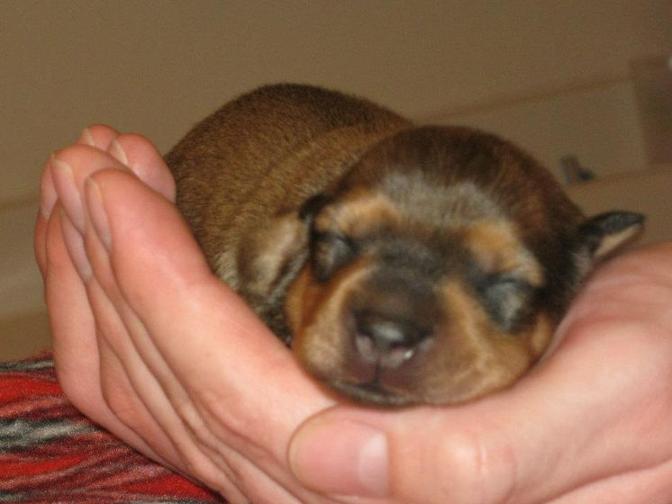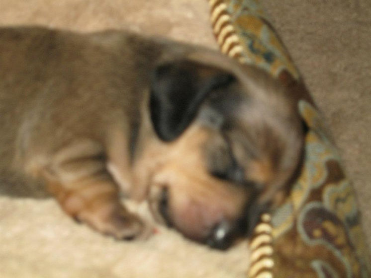 Bernie stayed here, but was never bred. He loves to nap in strange positions, and snores very loudly! He developed IVDD at age 5, and has helped us learn more about the disease and how happy an affected dog can be.